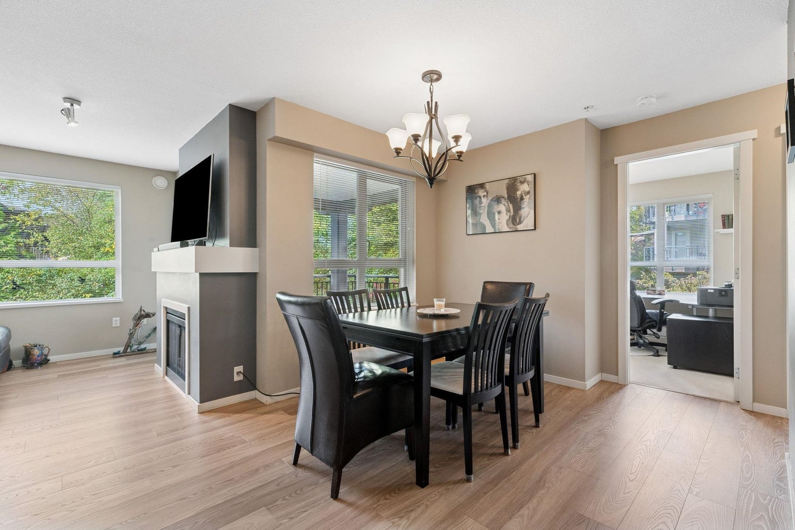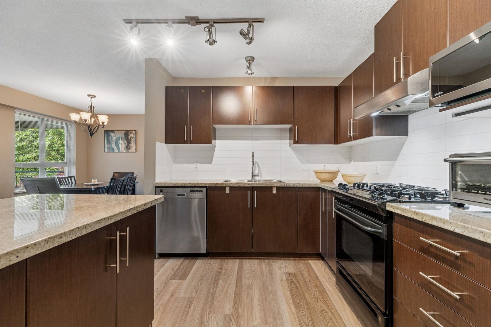 Boardwalk at Klahanie! Spacious 3 bed, 2 bath home overlooking a quiet greenbelt with a tranquil brook. Gourmet kitchen features granite counters, island with breakfast bar, plenty of cabinetry & stainless sink with garburator. Bright living room offers an electric fireplace, picture window & French doors to a covered deck—ideal for year-round BBQs. Deluxe primary suite with 2 closets & spa-like ensuite with double sinks, soaker tub & separate shower. Brand new waterproof vinyl plank floors! Strata has approves this unit for AC. Includes 2 parking stalls. Perfect location near shops, coffee, Rocky Point & Inlet Trail, Restaurants, brewery row, with easy access to Old Orchard Park, White Pine Beach, Buntzen Lake & Belcarra. OPEN HOUSE November 23rd 2pm-4pm